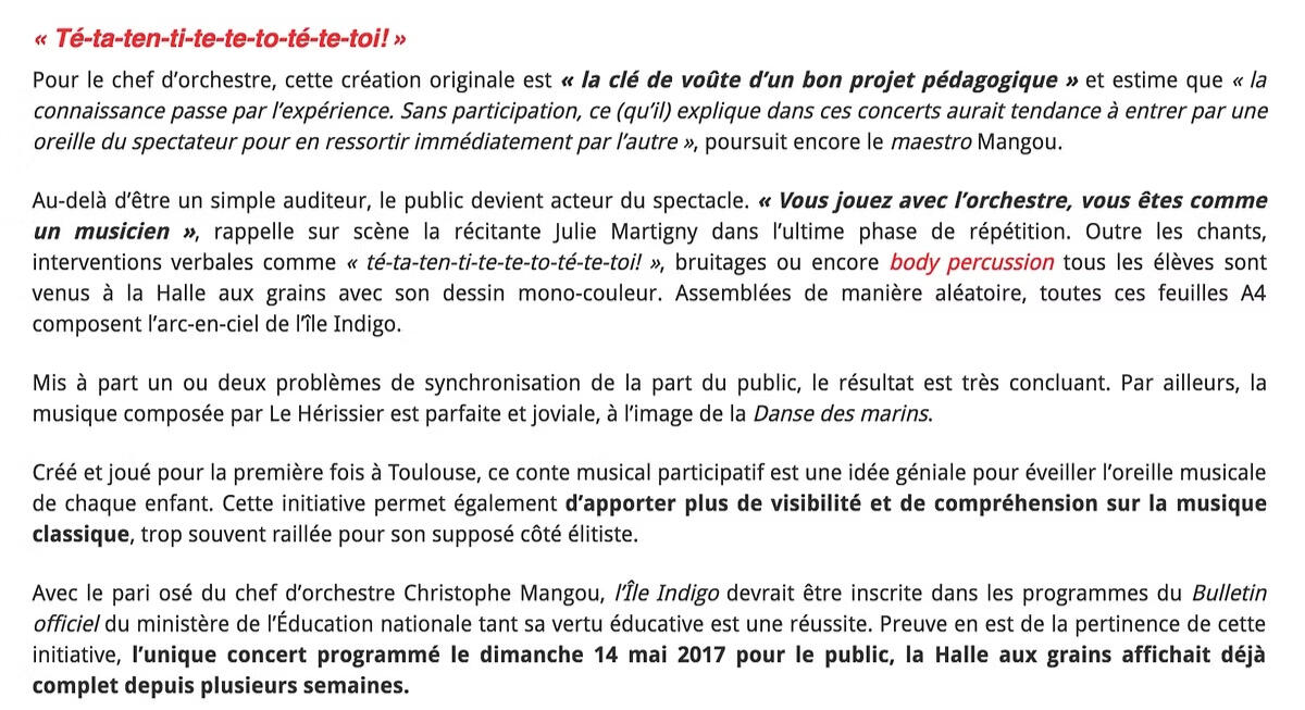 Avec la comédienne et autrice Julie Martigny, il crée ensuite deux contes musicaux, L’Île Indigo et Ondin et la Petite Sirène, en collaboration avec le chef Christophe Mangou et de nombreux orchestres prestigieux : Orchestre National du Capitole de Toulouse, Orchestre Régional Avignon-Provence, Orchestre National d’Île-de-France, Orchestre Régional de Normandie, Orchestre Philharmonique de Monte-Carlo, puis l’Orchestre Royal de Wallonie-Liège et l’Opéra de Rouen-Normandie.