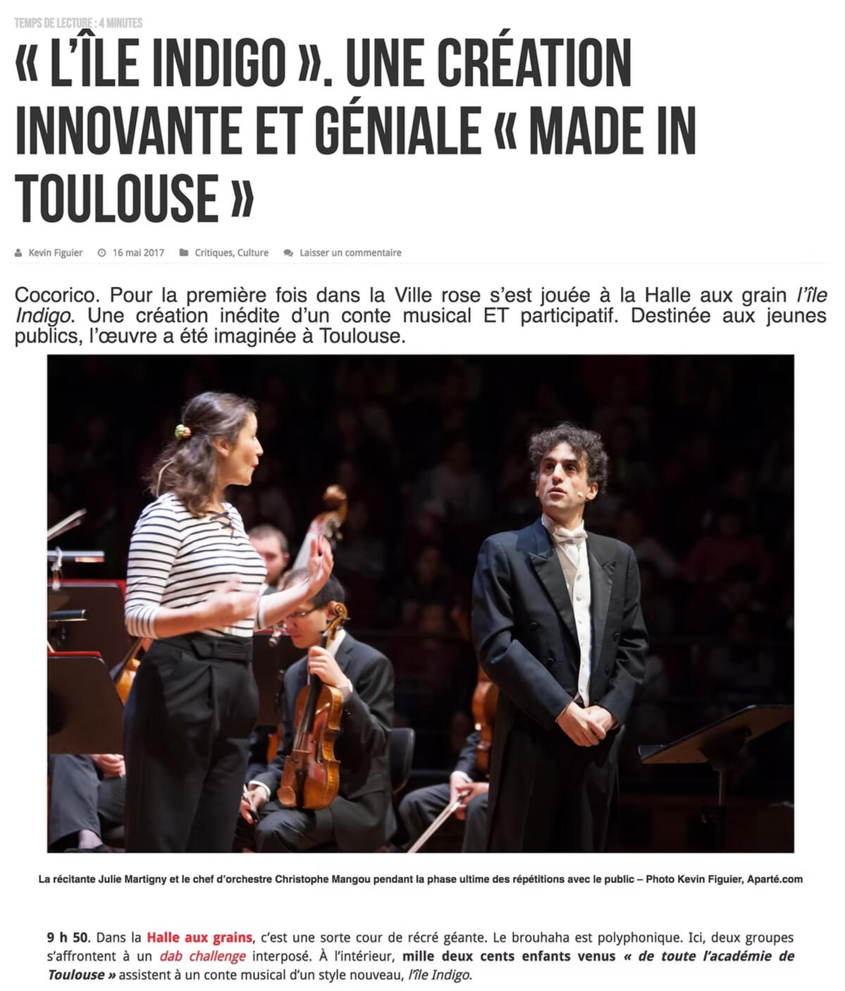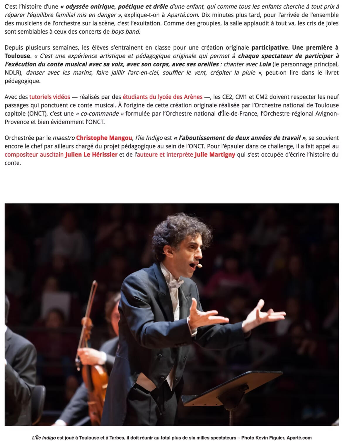 Avec la comédienne et autrice Julie Martigny, il crée ensuite deux contes musicaux, L’Île Indigo et Ondin et la Petite Sirène, en collaboration avec le chef Christophe Mangou et de nombreux orchestres prestigieux : Orchestre National du Capitole de Toulouse, Orchestre Régional Avignon-Provence, Orchestre National d’Île-de-France, Orchestre Régional de Normandie, Orchestre Philharmonique de Monte-Carlo, puis l’Orchestre Royal de Wallonie-Liège et l’Opéra de Rouen-Normandie.